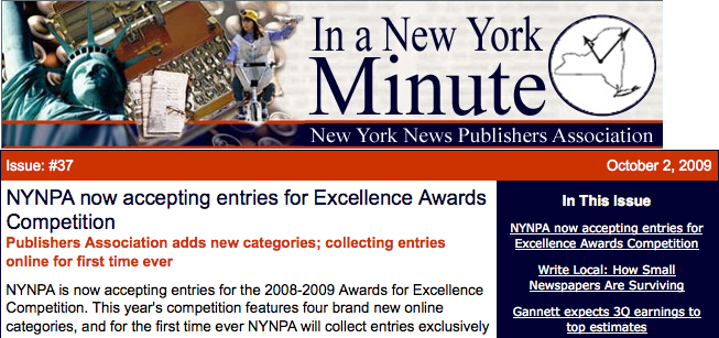 "In a New York Minute" is the free, weekly electronic newsletter of NYNPA, providing you with member news, money-saving and money-generating ideas, and upcoming events. To subscribe to In a "New York Minute" please click here. If you would like to provide us with member news please e-mail diane@nynpa.com. Members | Awards for Excellence | Resources | Newsletter | Job Bank | Other Services | Contact Us New York News Publishers Association, Inc.